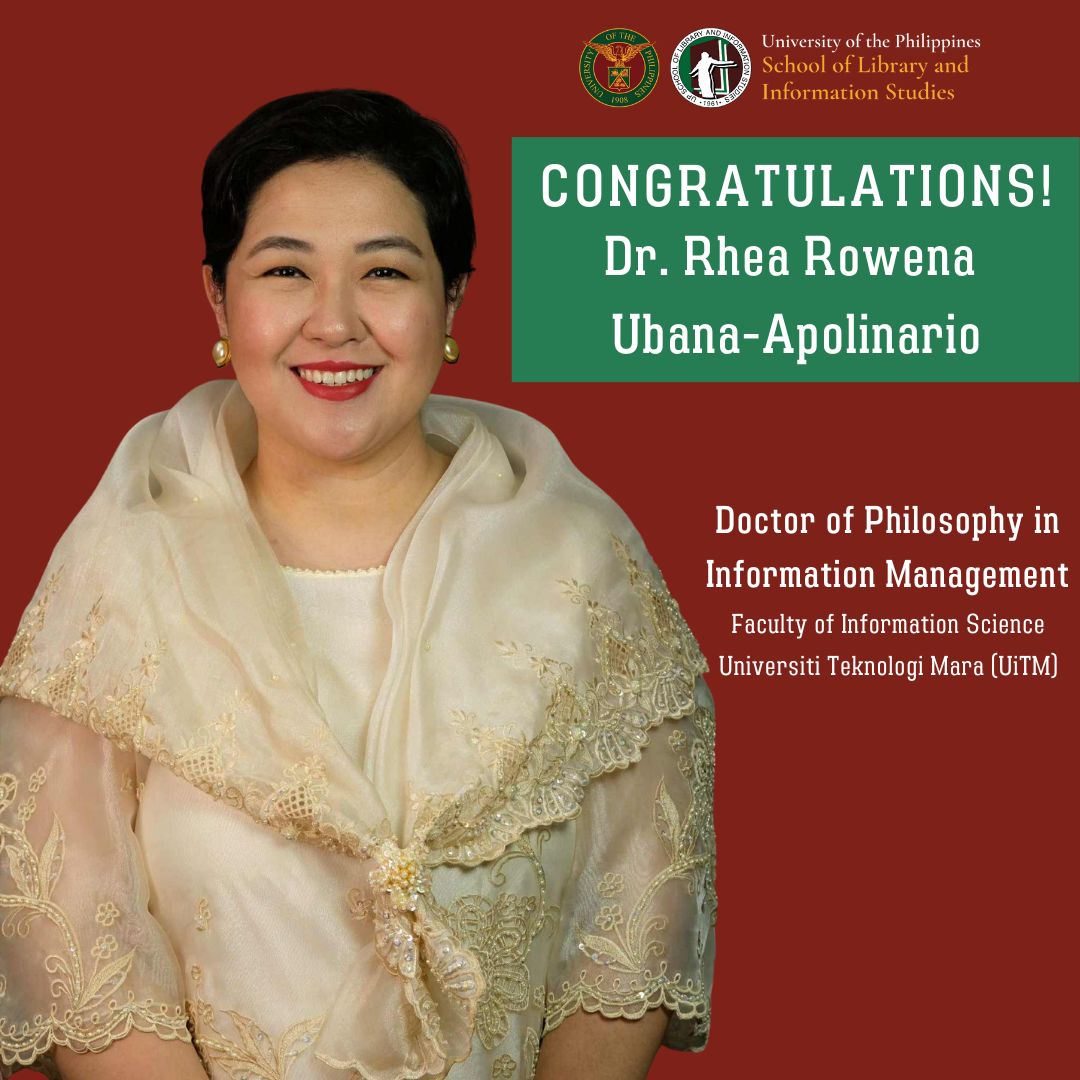UPSLIS proudly congratulates our Dean, Rhea Rowena Ubana-Apolinario, on completing her Doctor of Philosophy in Information Management at the Faculty of Information Science, Universiti Teknologi Mara (UiTM), Malaysia.