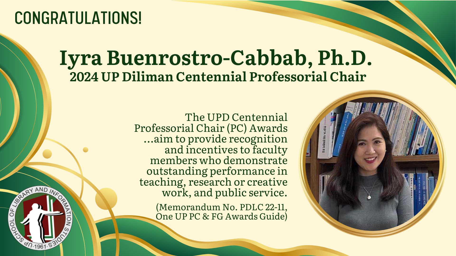 Congratulations to Assoc. Prof. Iyra Buenrostro-Cabbab, PhD for being awarded the 2024 UP Diliman Centennial Professorial Chair! This is her 3rd time to be bestowed with this recognition for her outstanding performance in teaching, research, and public service.