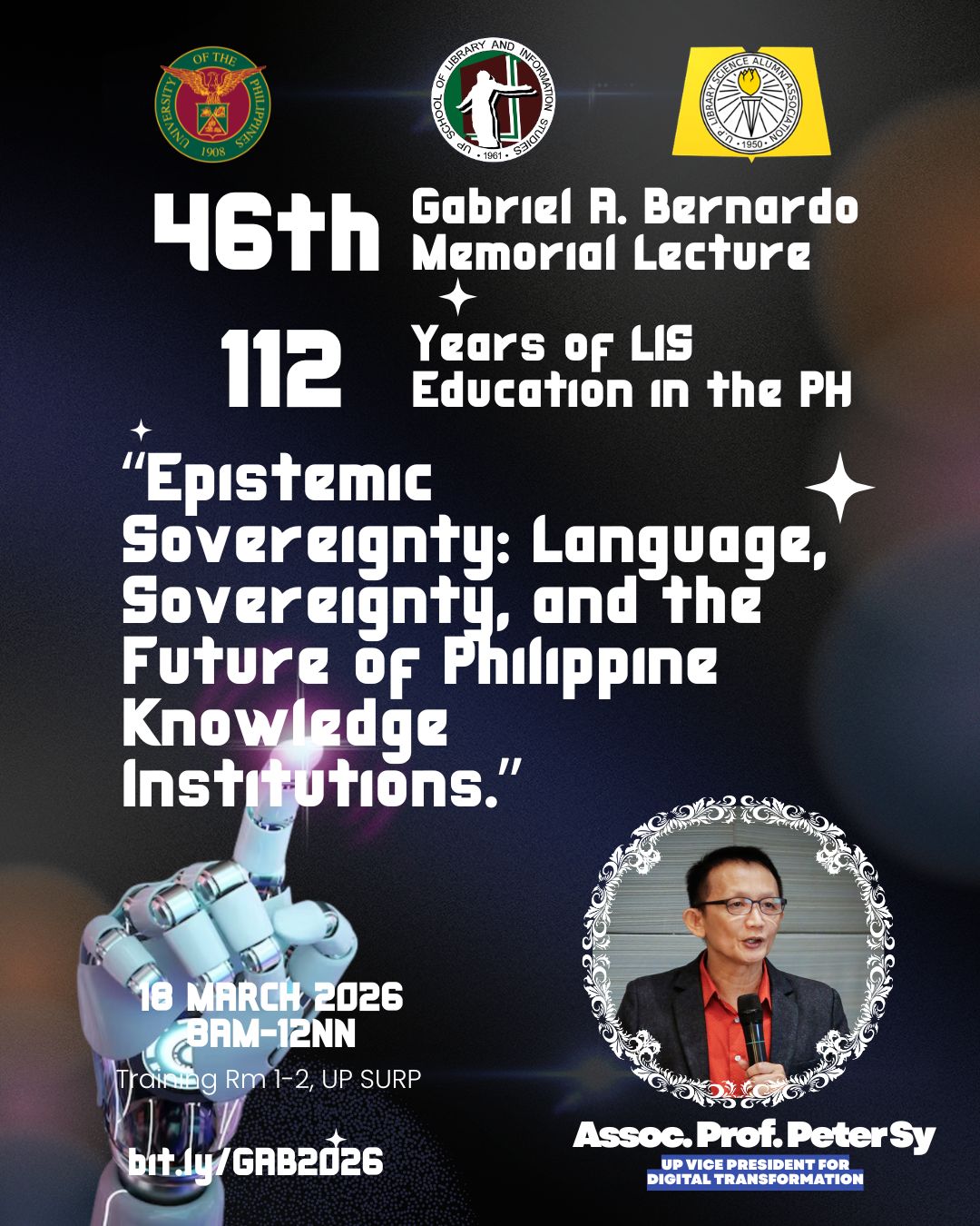 The University of the Philippines School of Library and Information Studies (UP SLIS), in cooperation with the UP Library Science Alumni Association, warmly invites you to the 46th Gabriel A. Bernardo Memorial Lecture, commemorating 112 Years of Library and Information Science Education in the Philippines.
