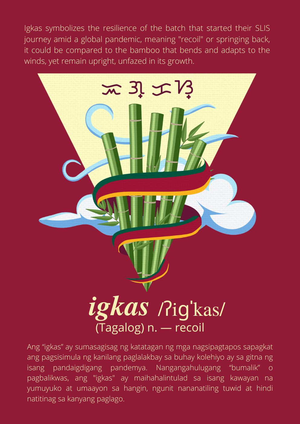 “Igkas symbolizes the resilience of the batch that started their SLIS journey amid a global pandemic, meaning "recoil" or springing back, it could be compared to the bamboo that bends and adapts to the winds, yet remains upright, unfazed in its growth.“